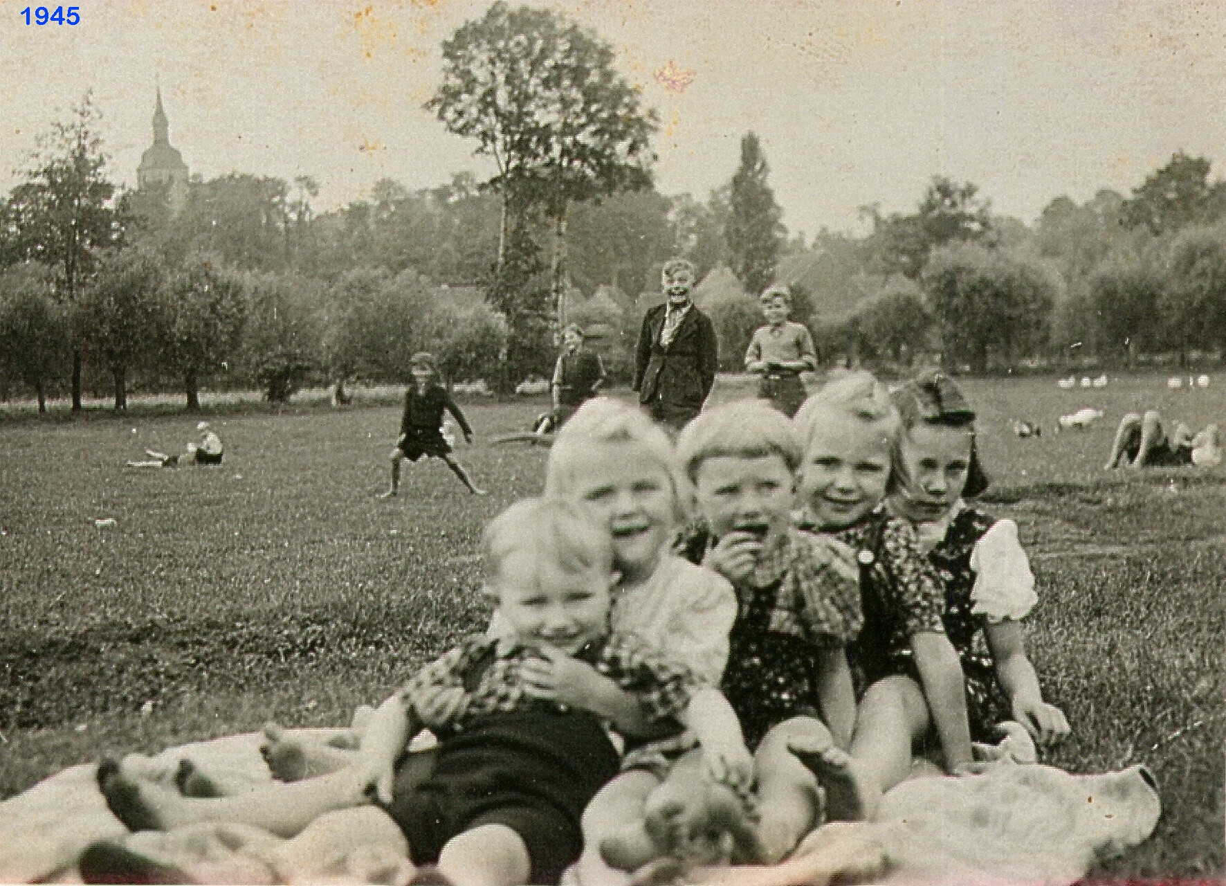 Diese Fotos entstand ca. 1945. Die Kinder sitzen auf der Wiese, vermutlich vor der Straße zwischen Großgrimma und Grunau, dafür spricht die Kirche im Hintergrund.